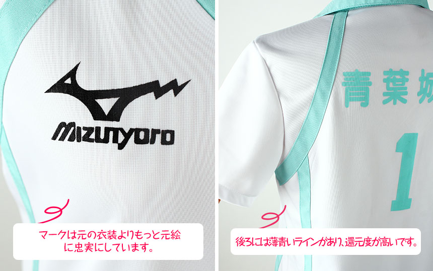 白を基調したジャージ生地にて製作します。正面には数字「1」と学校のマークがプリントされています。後ろには青葉城西の名前も付き、注目的です。