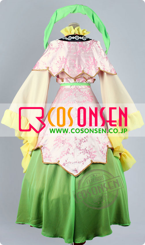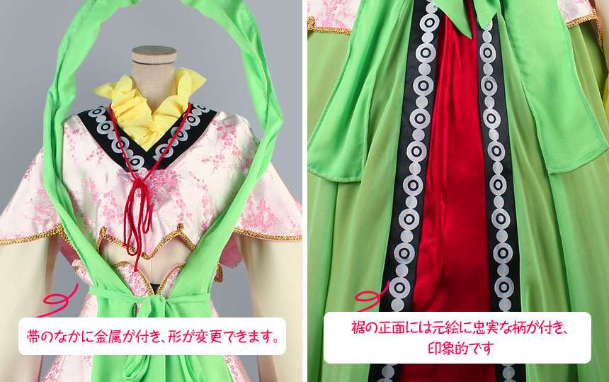 上着は黄色を基調したポリ混紡生地で製作し、スカートは緑を基調したサテン生地で製作します。正面には元絵と同じような柄が付き、印象的です。赤い部分はサテン生地で、ツルツルした感じがします。袖口には綺麗なレースが付き、原作に忠実に再現しました。