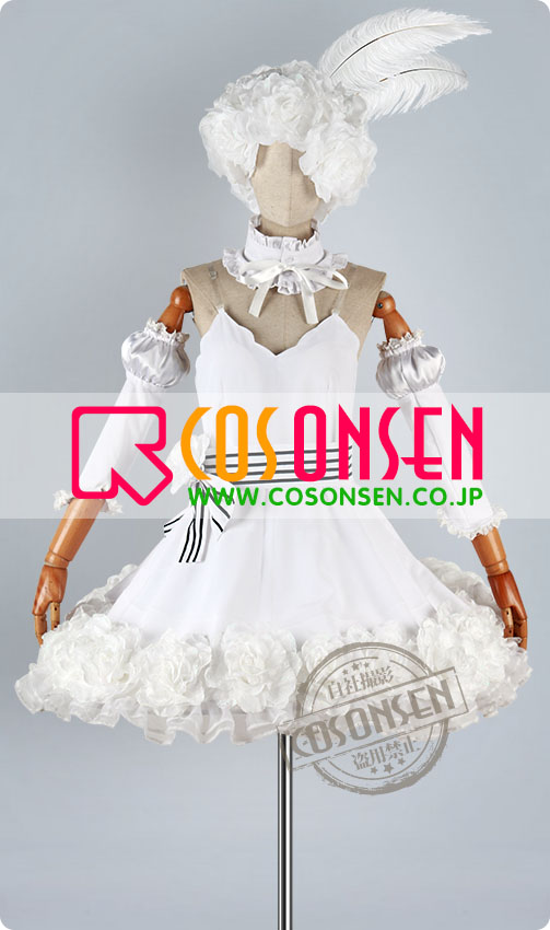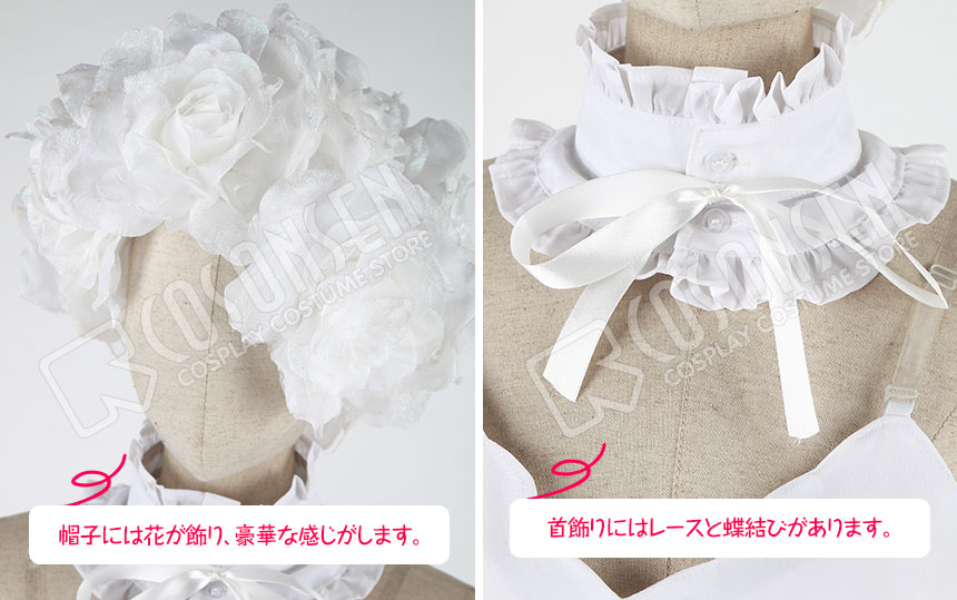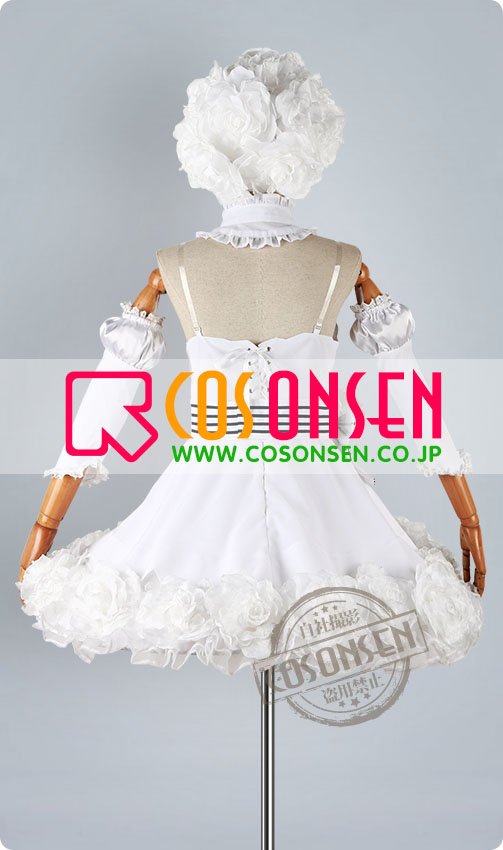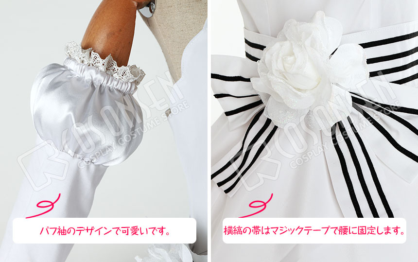 白を基調したポリ混紡生地にて製作します。腰には帯が付き、女性の魅力度をアップさせました。裾はオーガンジーの生地で、花も飾っています。派手なイメージが溢れれいます。