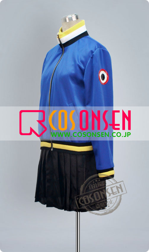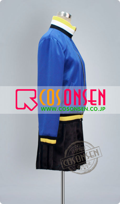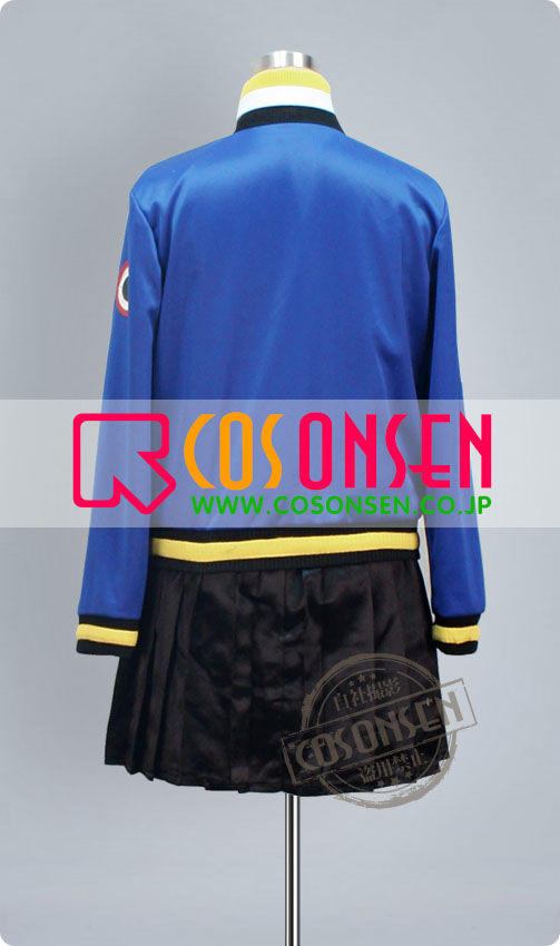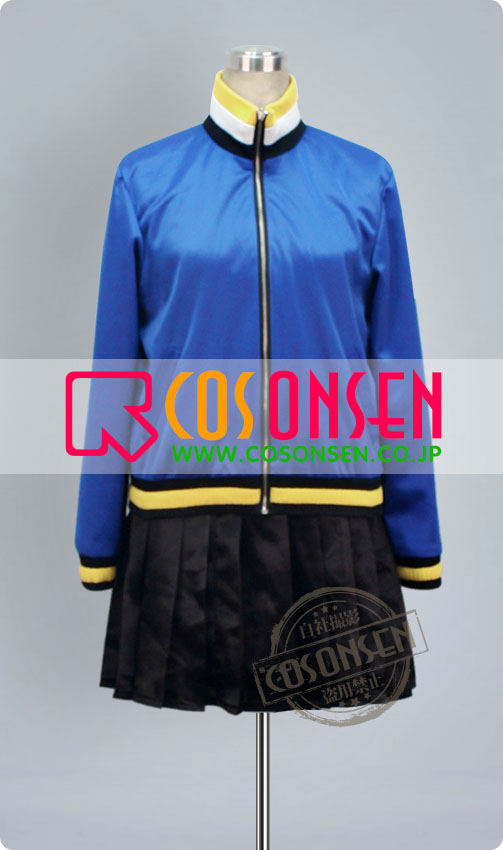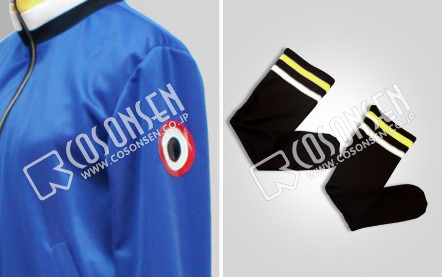青を基調したジャージ生地にて製作します。正面にはファスナーを使い、脱着が便利になりました。襟、袖口と裾には黄色いラインがあり、印象的です。元絵を完璧に再現しました。