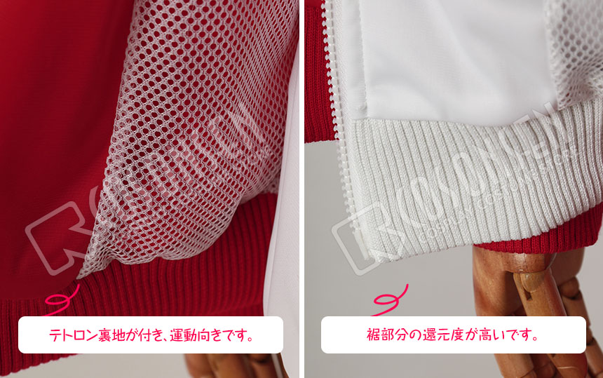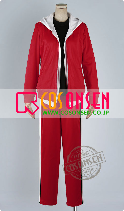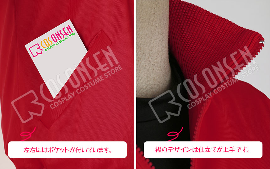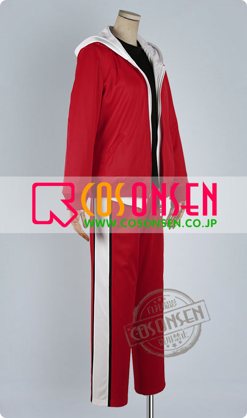 赤を基調したジャージ生地にて製作します。前はファスナー開けで、脱着しやすくなりました。特徴的な襟と袖口の形も再現しています。