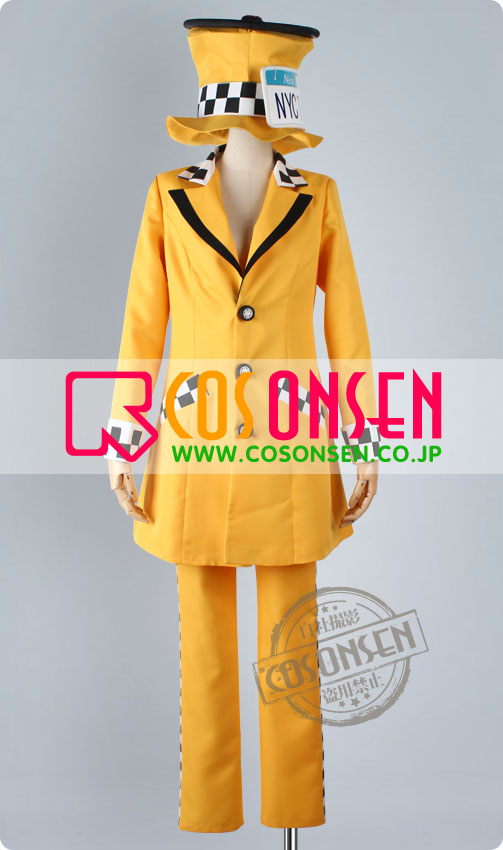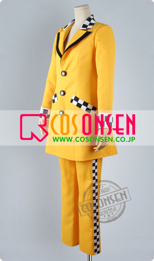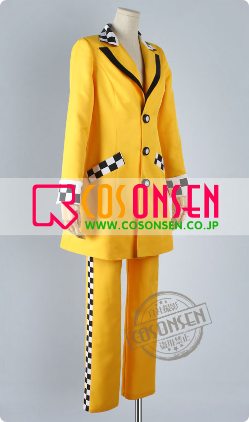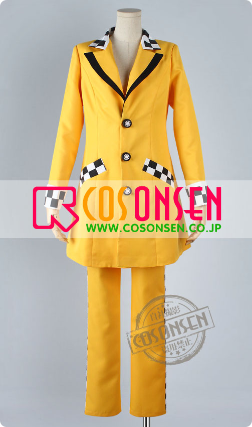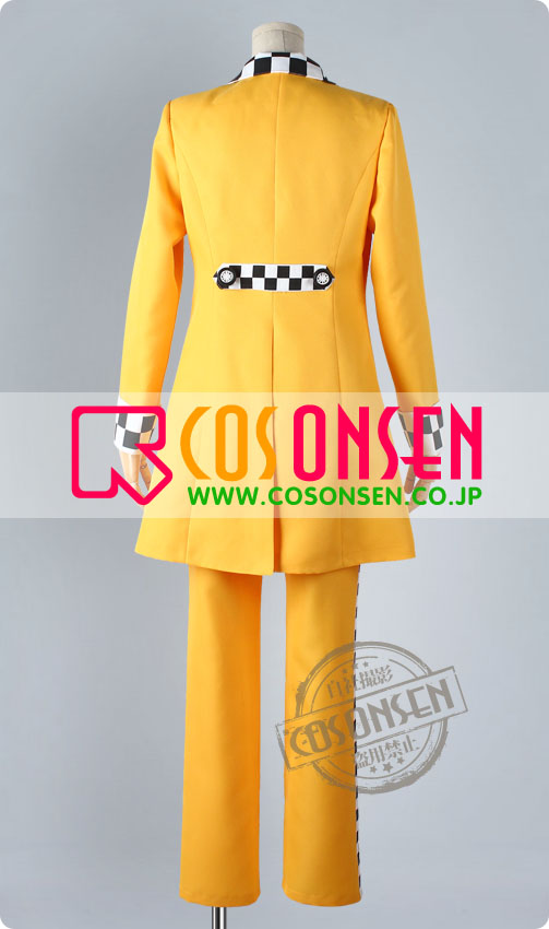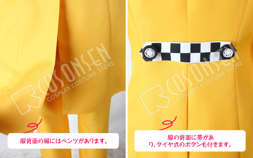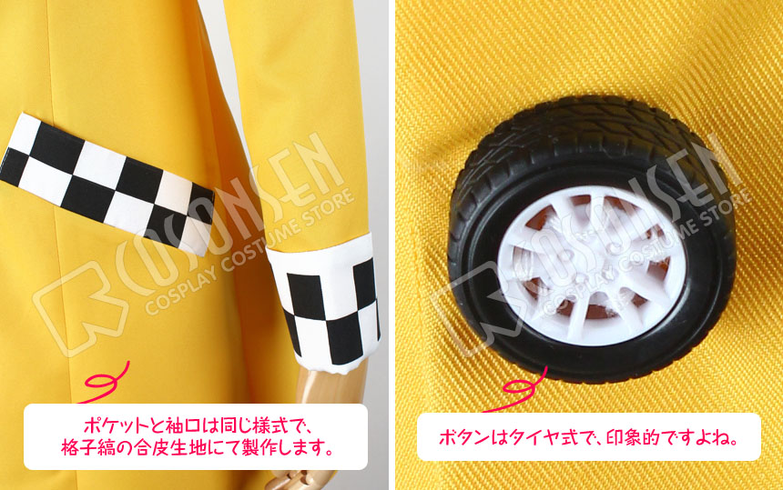 黄色を基調したポリ混紡生地にて製作します。襟の縁取りに黒いラインと格子縞があります。格子縞のポケットと袖口が付き、合皮生地にて製作します。ボタンはタイヤ式で、印象的ですよね。服の背面に帯があり、ボタンも付きます。