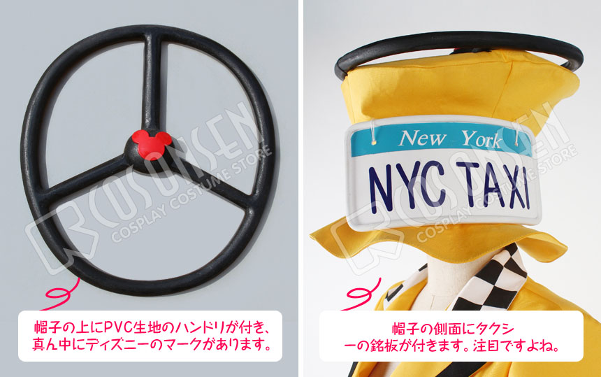 黄色を基調したポリ混紡生地にて製作します。帽子の上に大きなハンドルがあります。側面にタクシ-の銘板も付きます。注目ですよね。