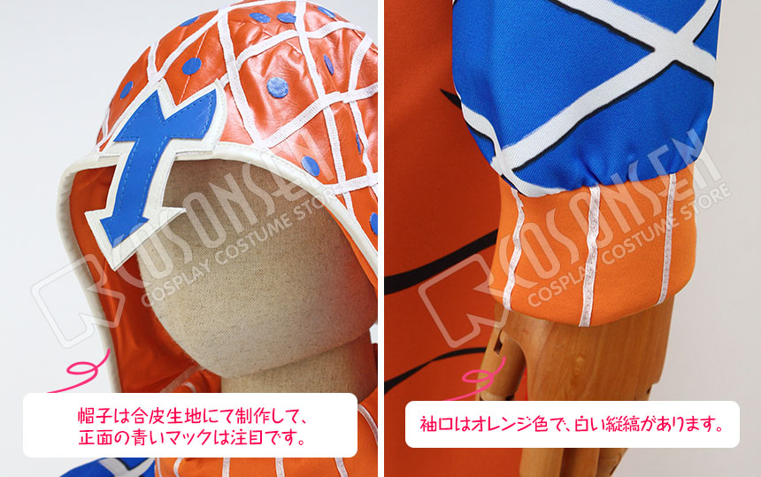 青を基調したポリ混紡生地にて製作します。上着には白い菱形のラインが付きます。服の裾、襟と袖口はオレンジ色で、白い縦縞があります。腰は露出式で、特別です。