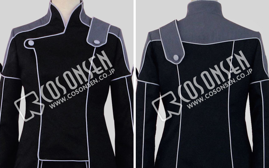 黒を基調したポリ混紡生地にて製作します。肩部分はグレー色で、飾りもの付き。元絵を完璧に再現しました。