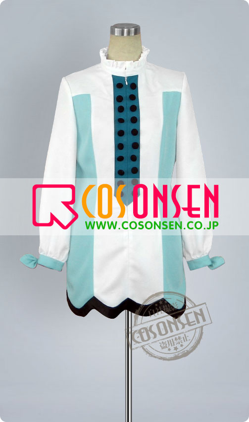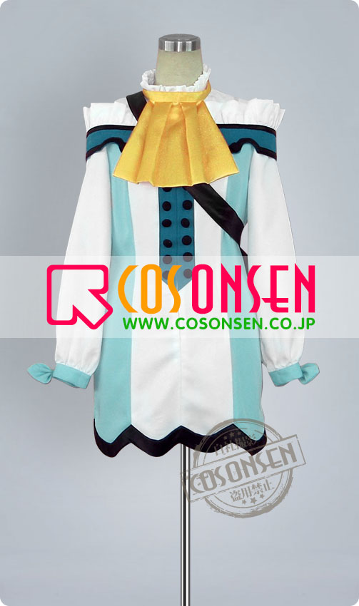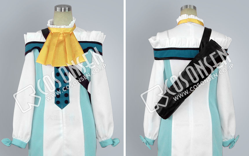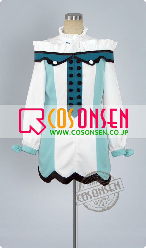 白を基調したポリ混紡生地にて製作します。立ち襟はレース風、袖口にリボンが飾られ可愛く仕上がりました。正面に飾った両列のボタンがアクセントに。ファスナーで着脱します。欧風に溢れている衣装です。