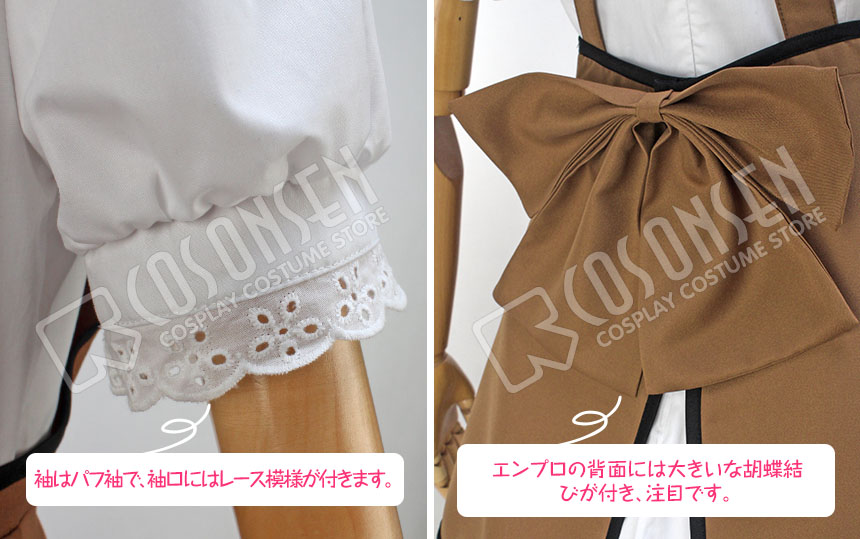 白を基調したシャツ生地にて製作します。パフ袖で、袖口にはレース模様が付きます。ワンピースの裾にも同じ様式のレース模様があり、念入りな仕上がりです。