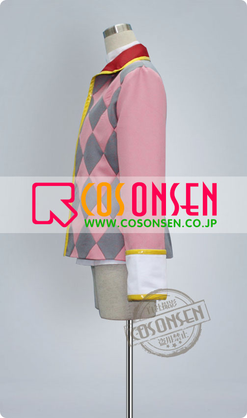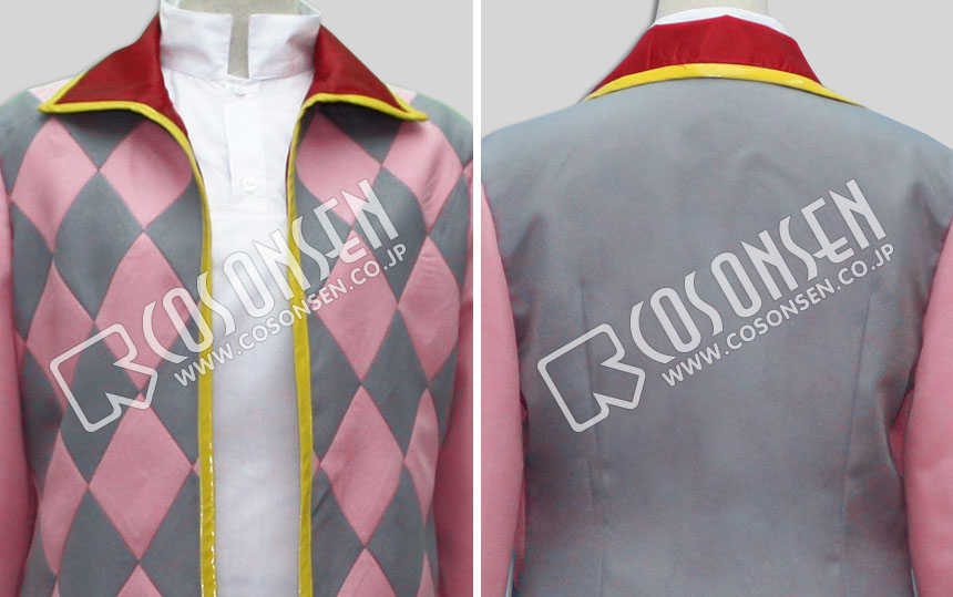 衣装の正面は格子縞で反面は灰色です。襟元は赤いで黄色の縁取りが付きます。