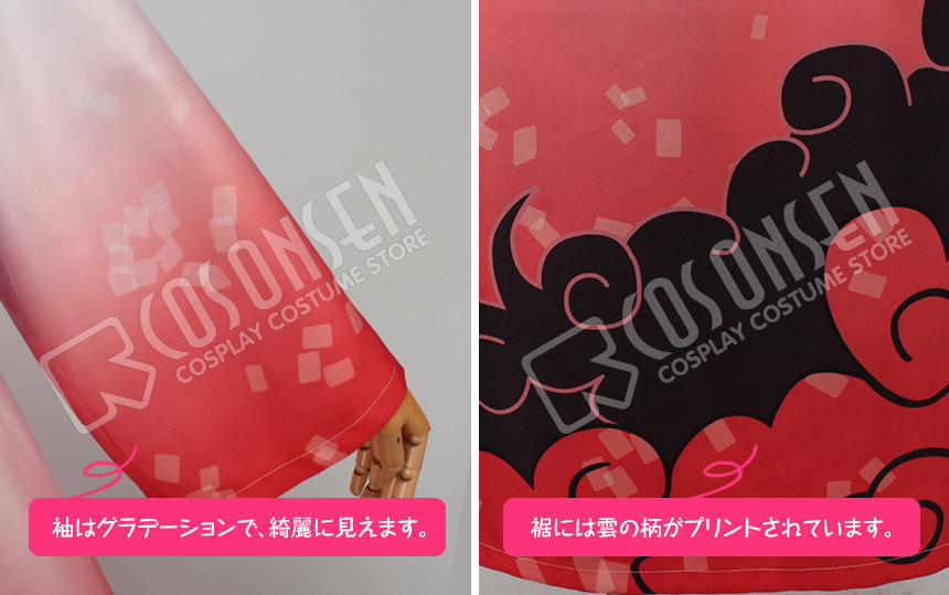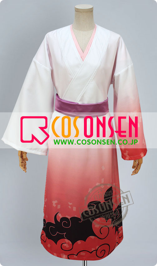 ポリ混紡生地にて製作した着物です。グラデーションで、綺麗に見えます。裾には雲の柄がプリントされ、見事に原作を再現しました。