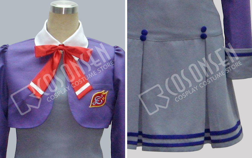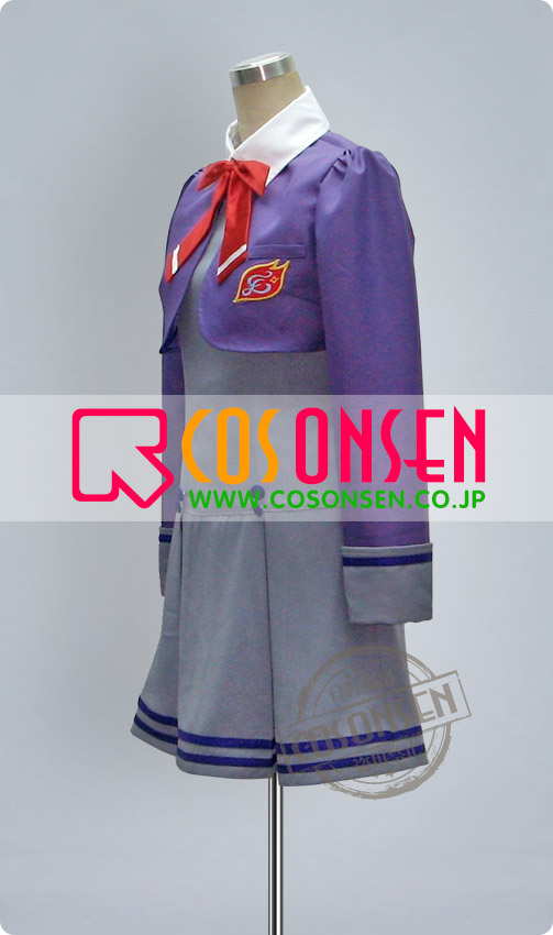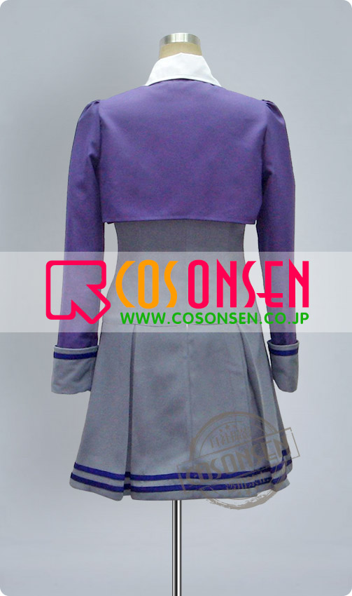 紫を基調したポリ混紡生地にて製作します。袖口はワンピースと同じ灰色です。左胸には校徽があります