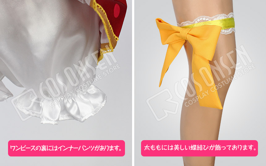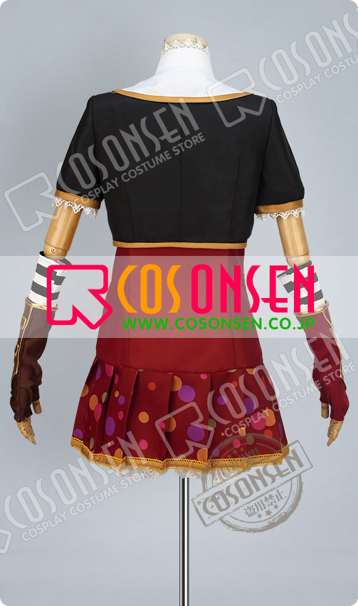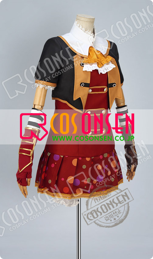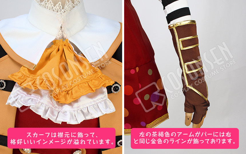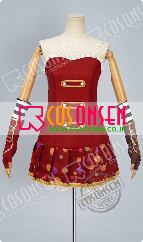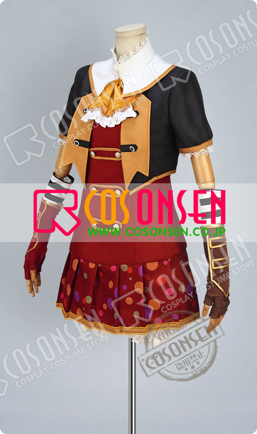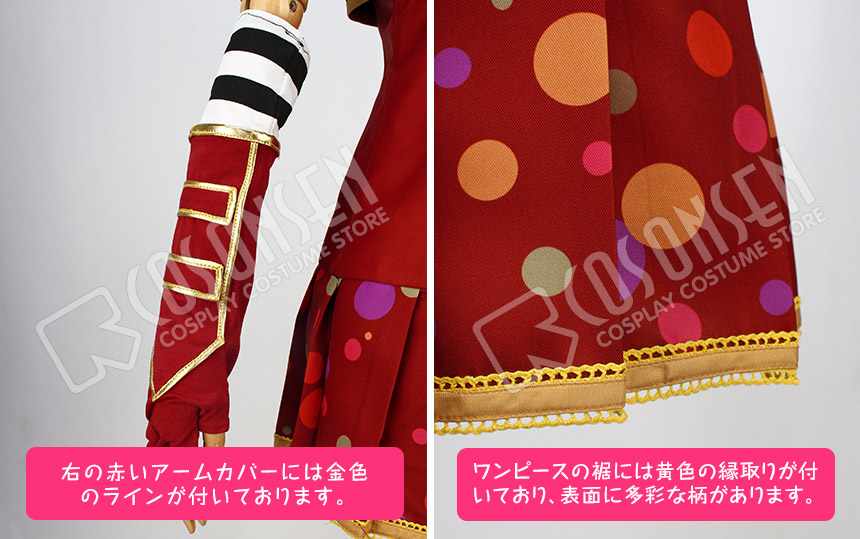 赤を基調したポリ混紡生地にて製作します。正面と腰側には豪華なボタンが付いており、格好いいイメージが溢れています。左右のアームカバーの色が違っており、特別なデザインで目立っています。多彩で大小の違った柄が裾に飾っており、見事に原作を再現しました。さらに、裾はプリーツ式で、女の魅力度を簡単にアップさせられます。