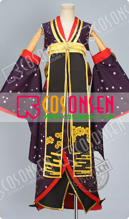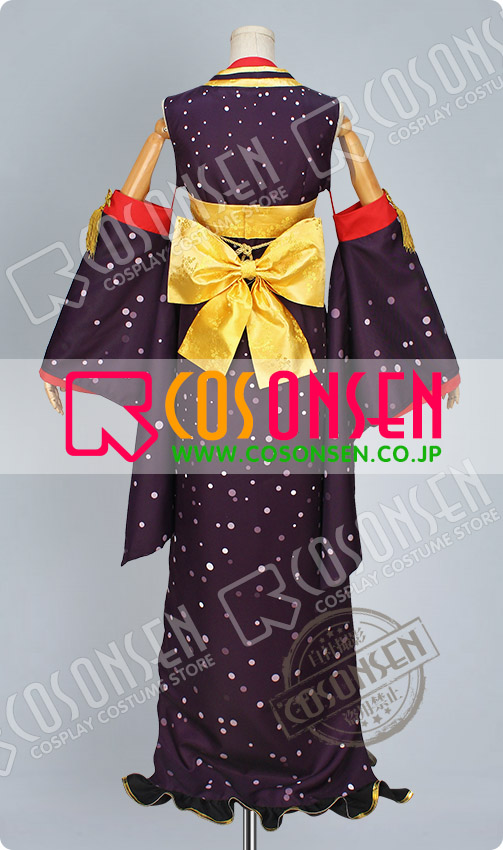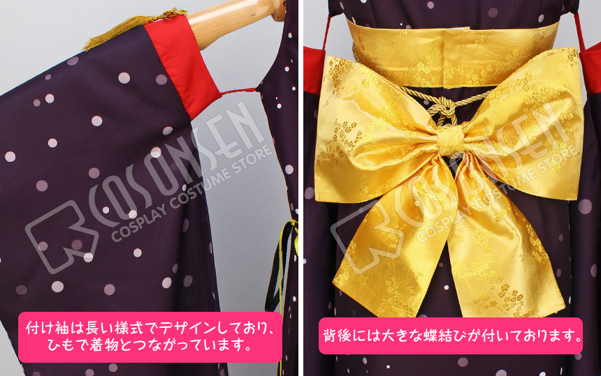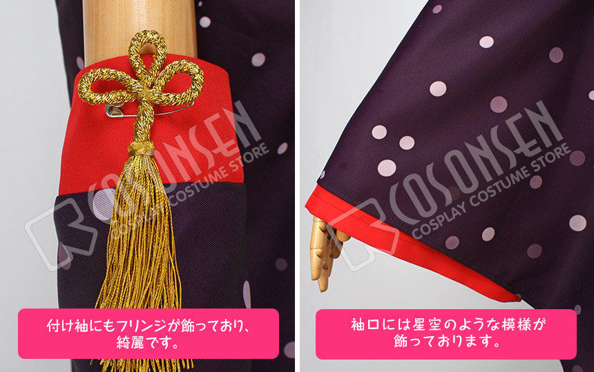 紫を基調したポリ混紡生地にて製作します。全体は星空のような円の柄が飾っており、クオリティが高いです。袖はひも和服と繋がり、特別なデザインでとても印象的です。