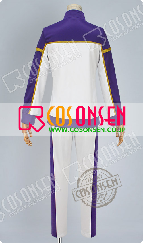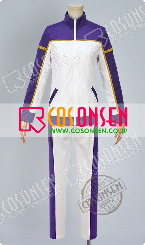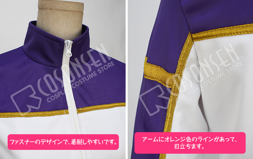 白と紫を基調したジャージ生地にて製作します。サテン生地のラインが付き、クオリティが高いです。さっぱりした感じが溢れています。正面はファスナーを使い、脱着が簡単にできます。