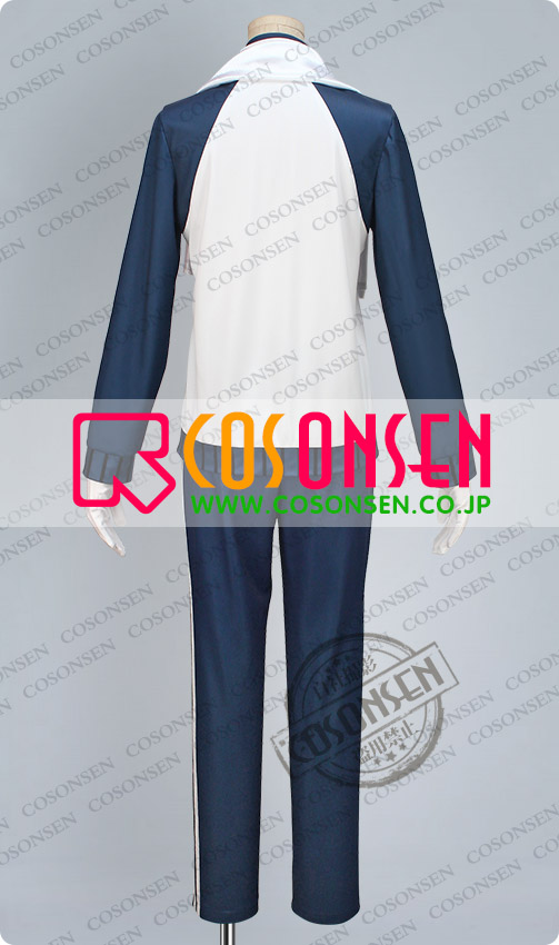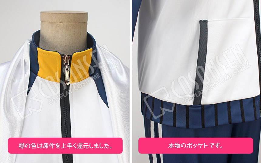 紺色を基調したジャージ生地にて製作します。職人により作られています。細かいところも丁寧に製作されて、原作を見事に再現しました。