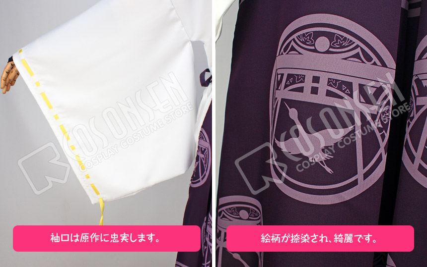 紫を基調したポリ混紡生地にて製作します。とても上品な袴です。絵柄が捺染され、原作に忠実します。