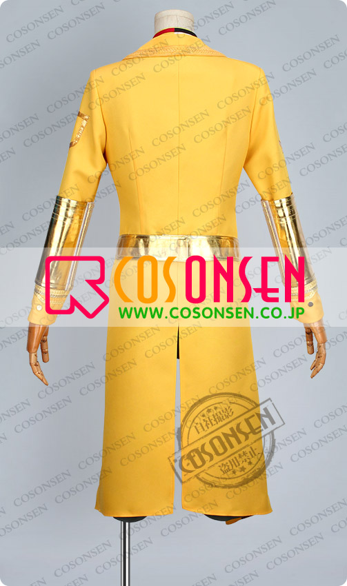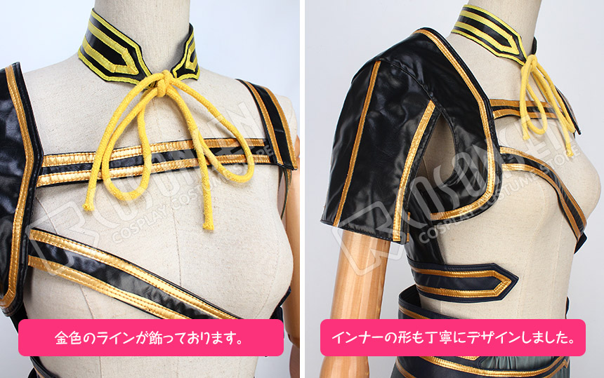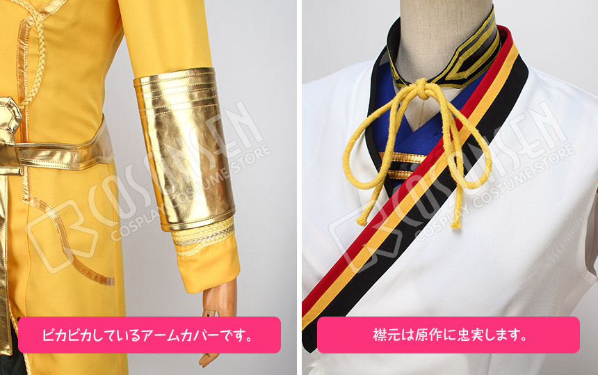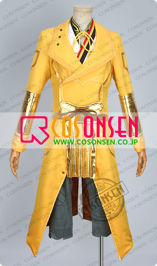 黄色を基調したポリ混紡生地にて製作します。デザインは原作に忠実して、ピカピカの防具も丁寧に飾っております。とても上品に見えます。
