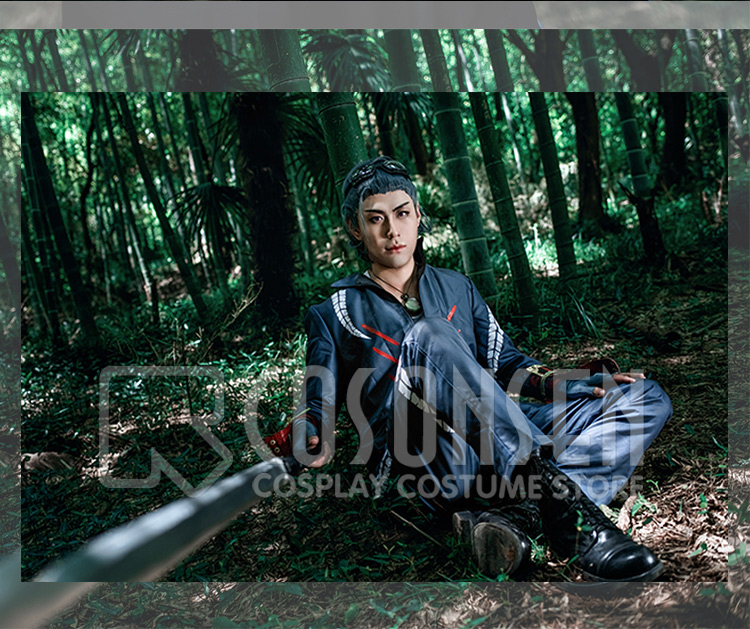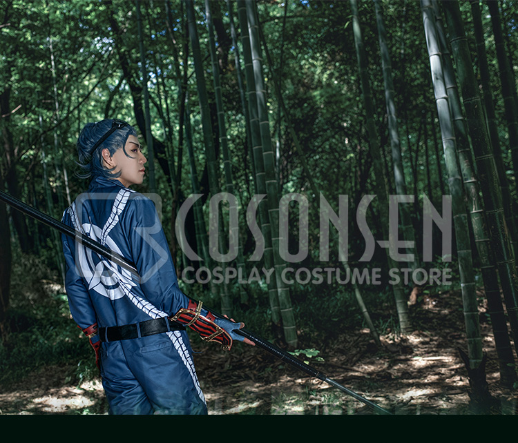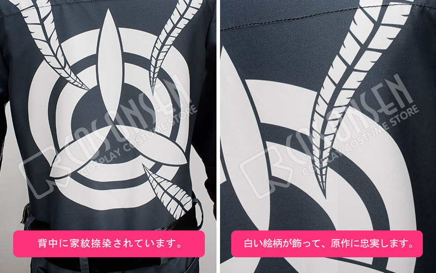 青を基調したポリ混紡生地にて製作します。様式は細かくデザインして、原作を見事に還元しました。白い絵柄と背中の家紋が捺染されており、綺麗です。正面にファスナーを使って、脱着は簡単にできます。