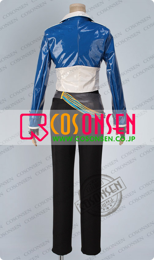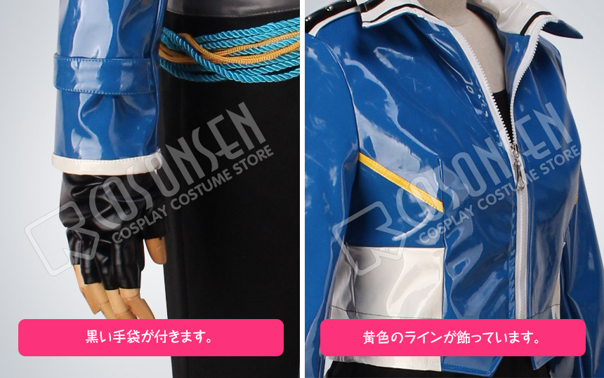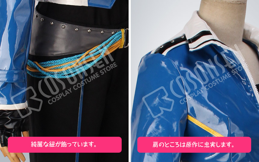 黒を基調したポリ混紡生地にて製作します。青いラインが飾っております。原作に忠実しました。