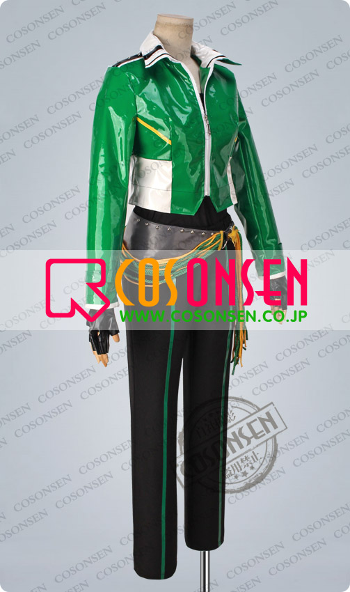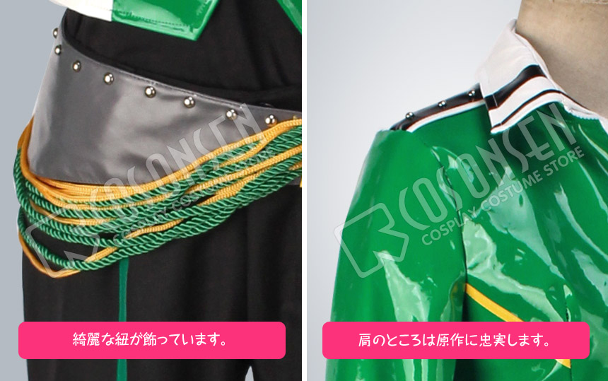 黒を基調したポリ混紡生地にて製作します。緑のラインが飾っております。原作に忠実しました。