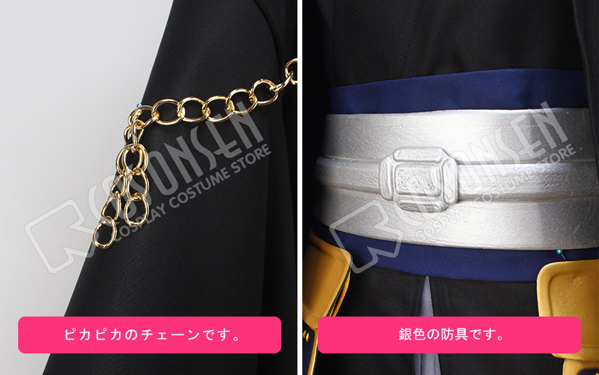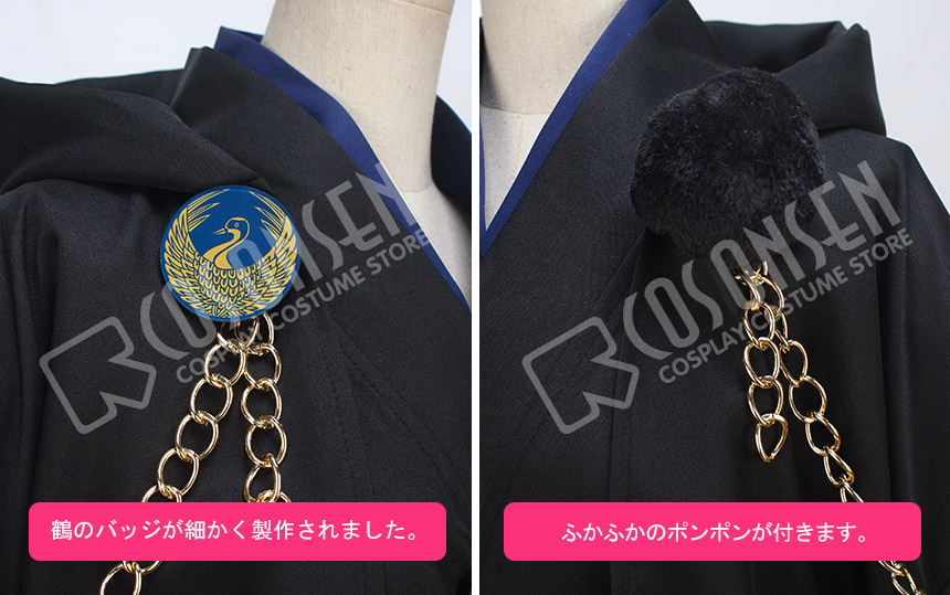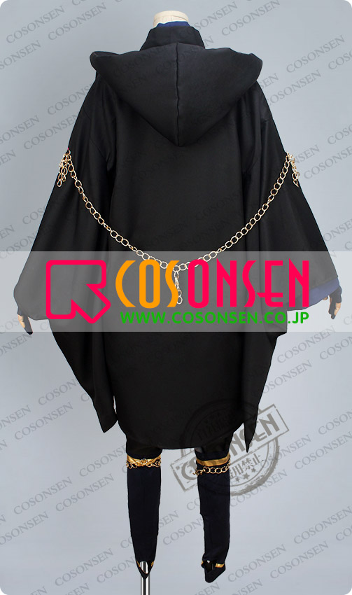 黒を基調したポリ混紡生地にて製作します。肩の下に金色のチェーンとバッジが付き、格好いいイメージが溢れています。袖口は大きく、長めに制作されて、とても綺麗です。羽織には大きい帽子も付いて、原作を完璧に再現しました。