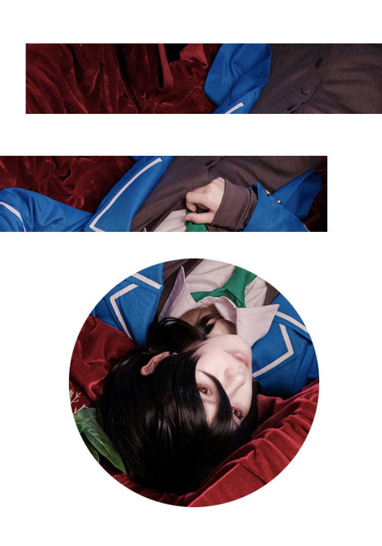 青を基調したポリ混紡生地にて製作します。襟に白いラインが飾って、綺麗です。胸の所に胸章が付き、原作を還元しました。二つのボタンで脱着は簡単にできます。
