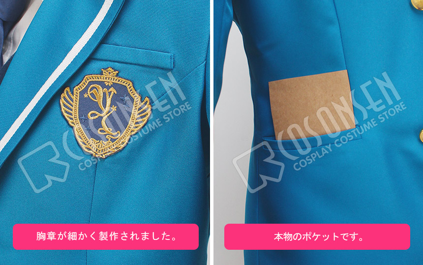 青を基調したポリ混紡生地にて製作します。襟に白いラインが飾って、綺麗です。胸の所に胸章が付き、原作を還元しました。