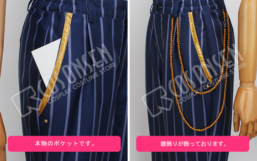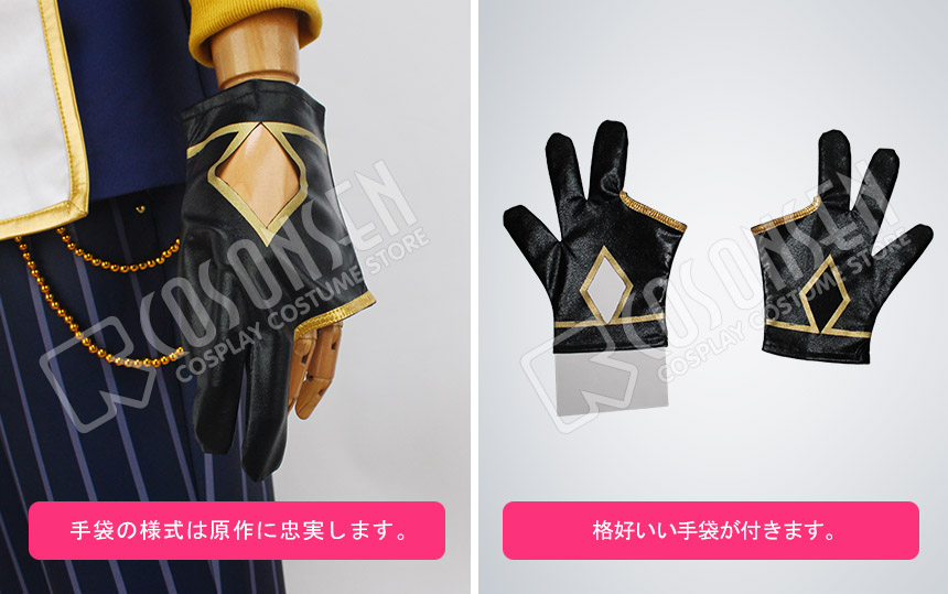 青と白を基調したポリ混紡生地にて製作します。金色の裾が飾っており、とても目立ちます。正面に精妙なボタンが飾っており、原作を上手く還元しました。肩に金色の紐とフレンジ式の飾りがあって、格好良く見えます。