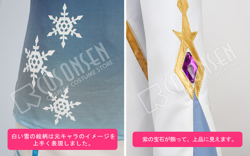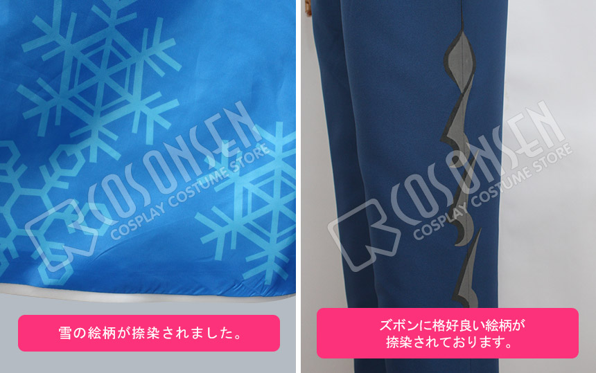 青を基調したニット生地にて製作します。グラデーションカラーを使って、原作に忠実します。雪の絵柄が幾つ飾っており、元キャラのイメージが上手く表現しました。胸に綺麗な飾りが飾っており、上品に見えます。