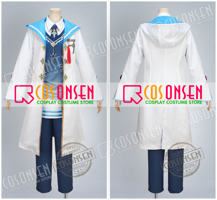 青と白基調したポリ混紡生地にて製作します。帽子付きのコートです。表裏の色まで丁寧に選び、スナップと裾に金色のラインが飾って、とても目立ちます。袖に紫の宝石が付き、神秘な感じが溢れています。
