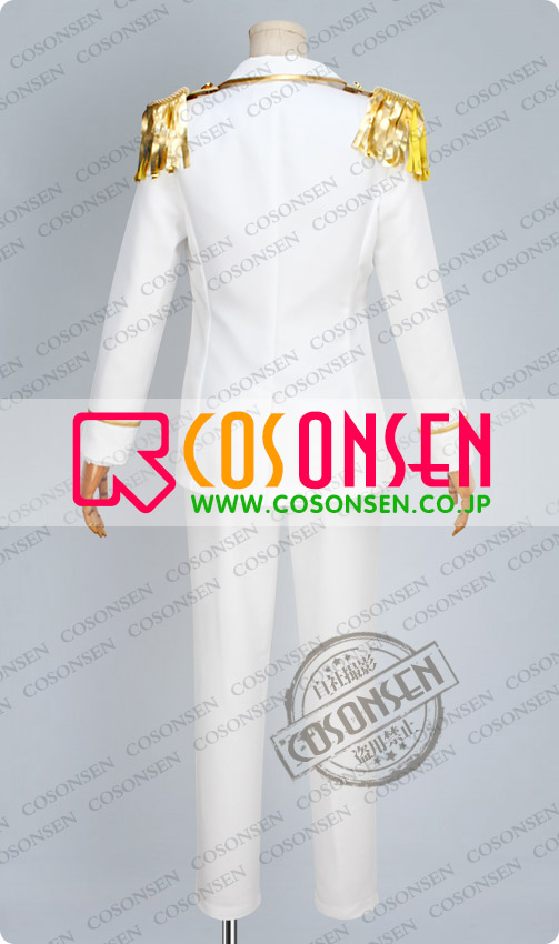 白を基調したポリ混紡生地にて製作します。襟元に金色の縁取りと黄色の絵柄が飾っており、格好良く見えます。袖口に金色のラインが飾って、綺麗です。肩にフレンジ式の飾りがとてもファションです。