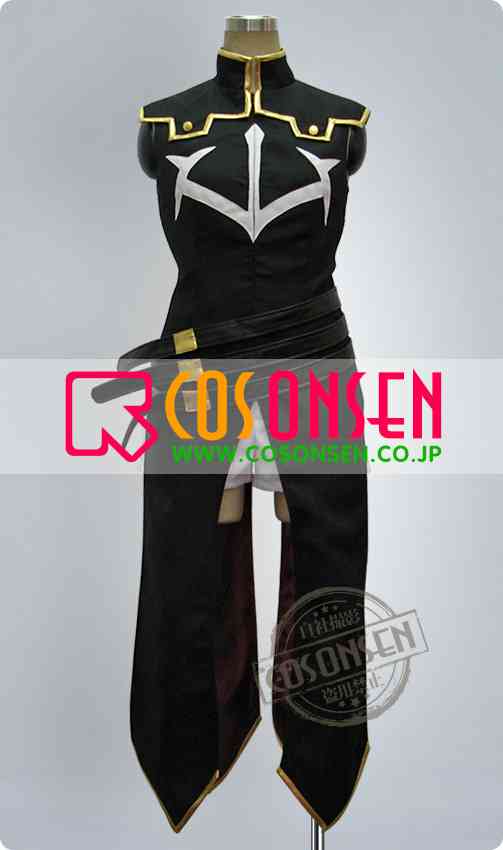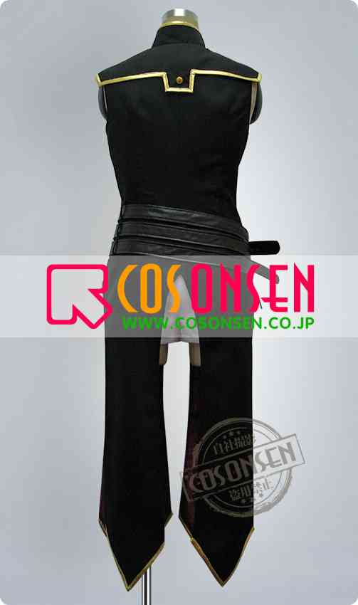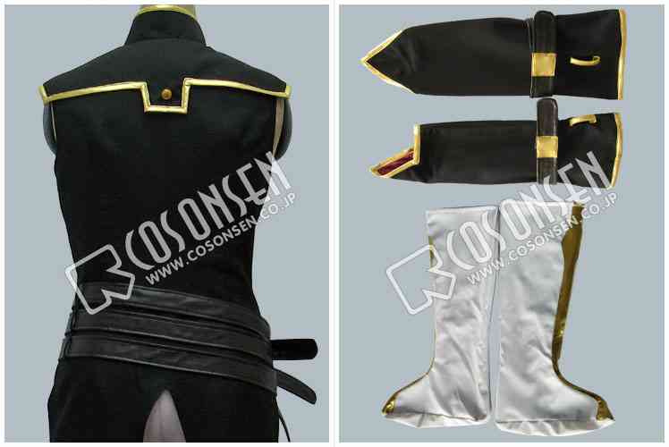 黒を基調したポリ混紡生地で製作いたしました。肩部分と裾には金色のラインが入っています。前身には原作と同じような紋様がプリントされています。