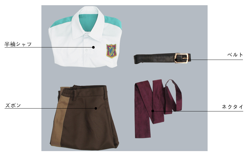 半袖シャツ、ズボン、飾り物(ネクタイ、ベルト)