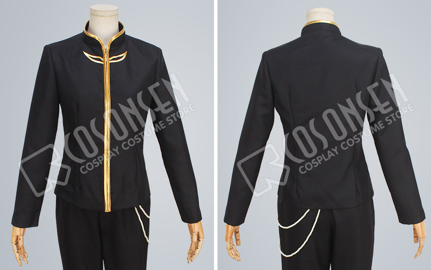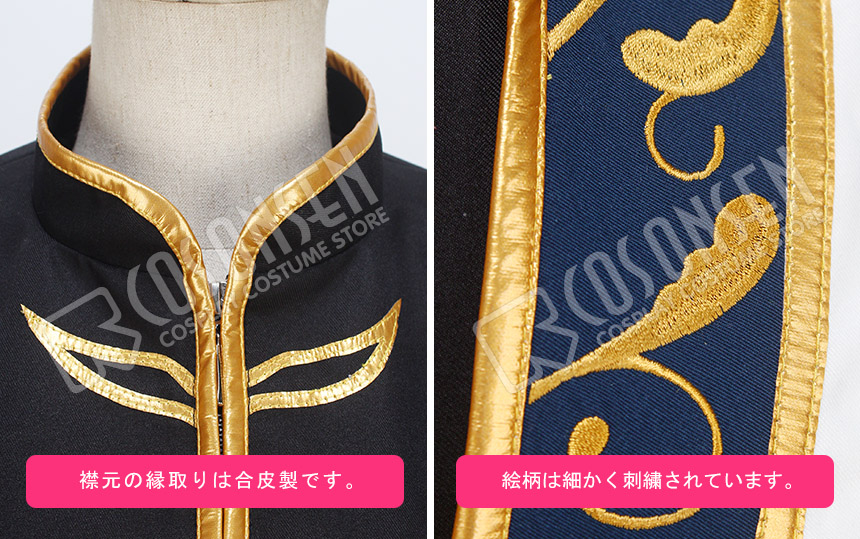 黒を基調したポリ混紡にて製作します。金色のラインは真中にあります。華麗だけではなくて原作も更に再現します。