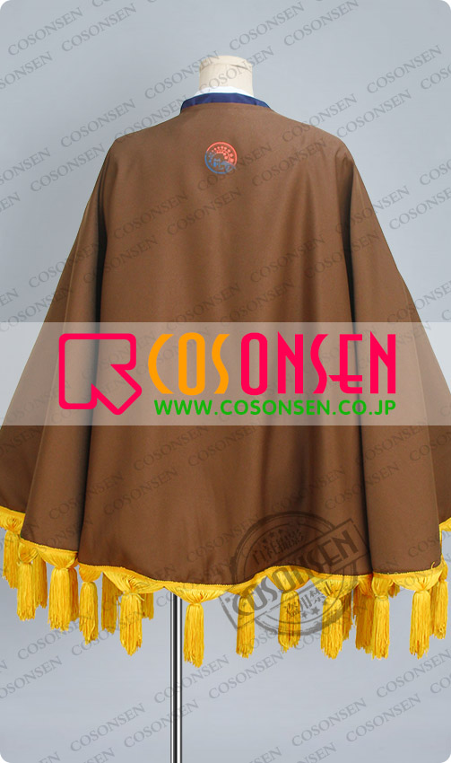 ブラウンを基調したポリ混紡にて製作します。マントにフレンジが付けっており、裏地は綺麗な絵柄があり、原作を忠実に再現しました。