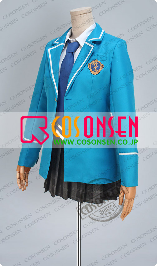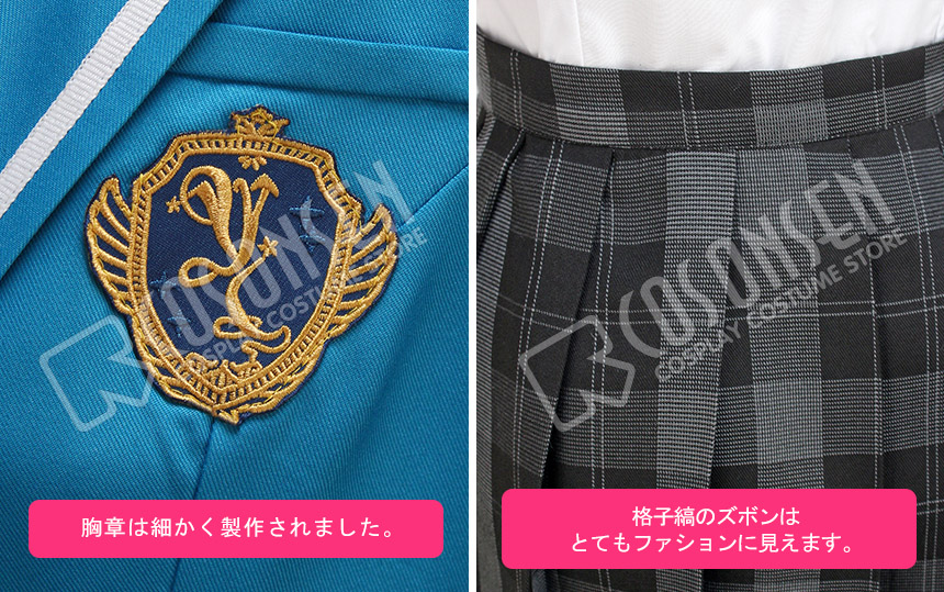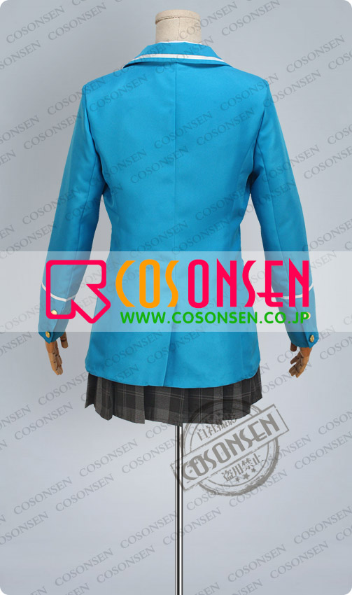 青を基調したポリ混紡生地にて製作します。襟に白いラインが飾って、綺麗です。胸の所に胸章が付き、原作を還元しました。二つのボタンで脱着は簡単にできます。