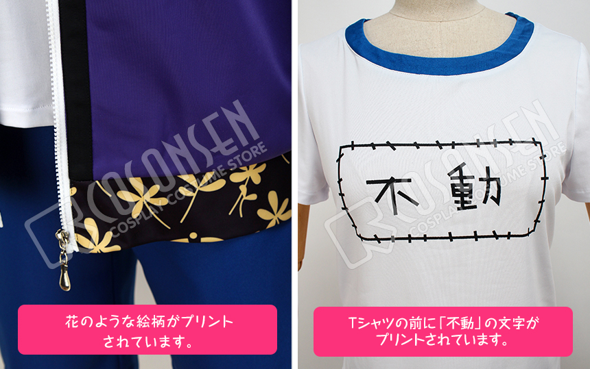紺色を基調したジャージにて製作します。フードと裾に綺麗な絵柄がプリントされています。ファスナーで簡単に脱着できます。