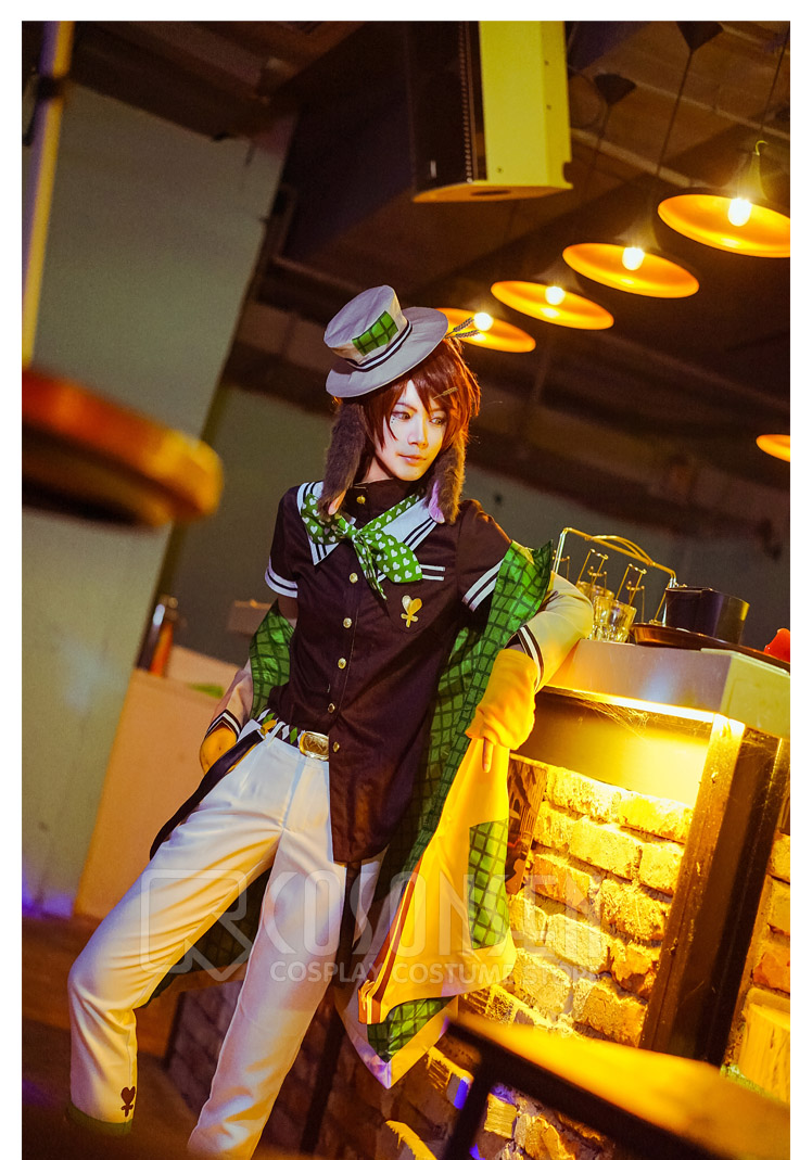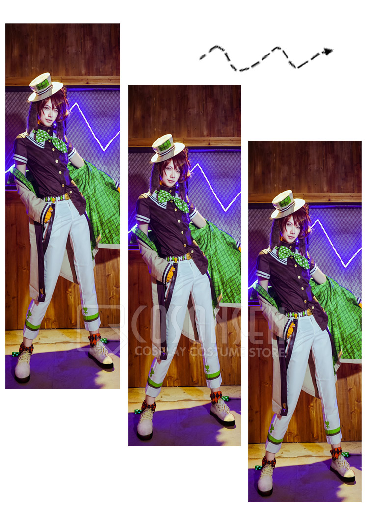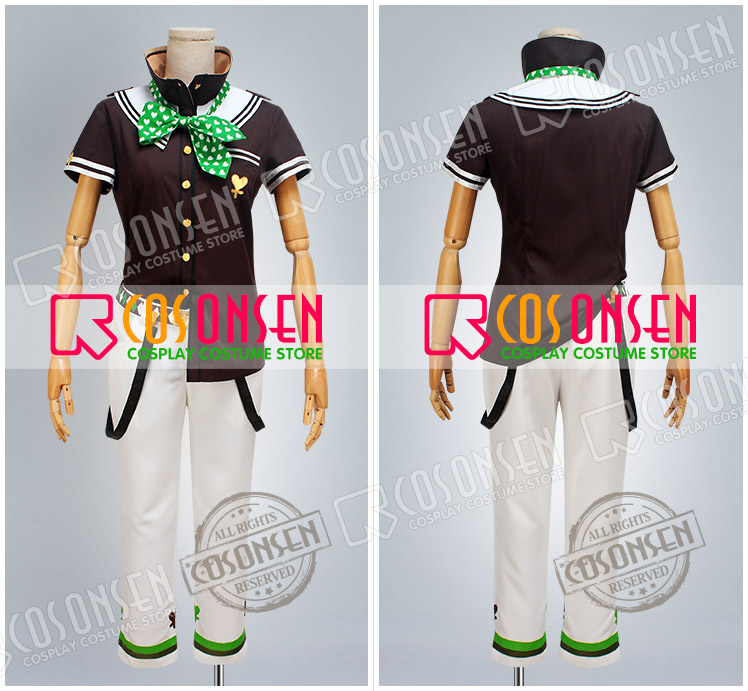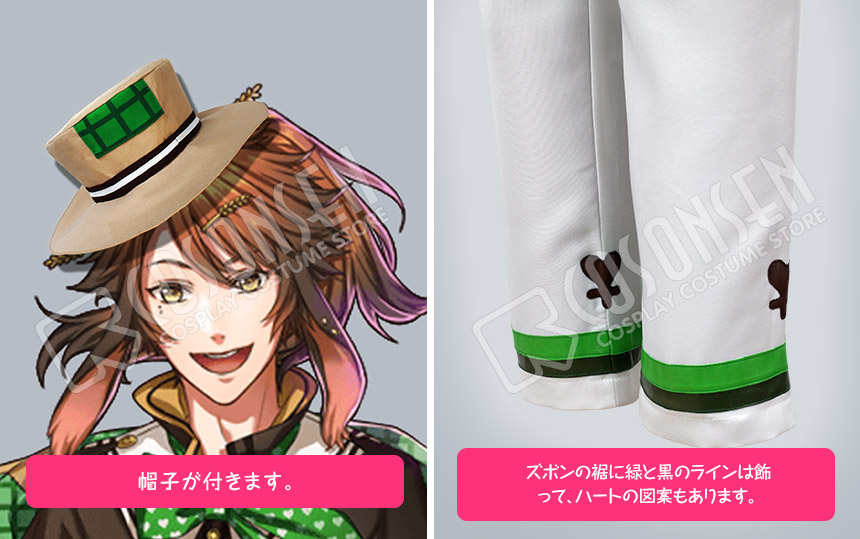 白を基調したポリ混紡にて製作します。裾にハートのような図案はあり、黒と緑のラインも原作に忠実しています。