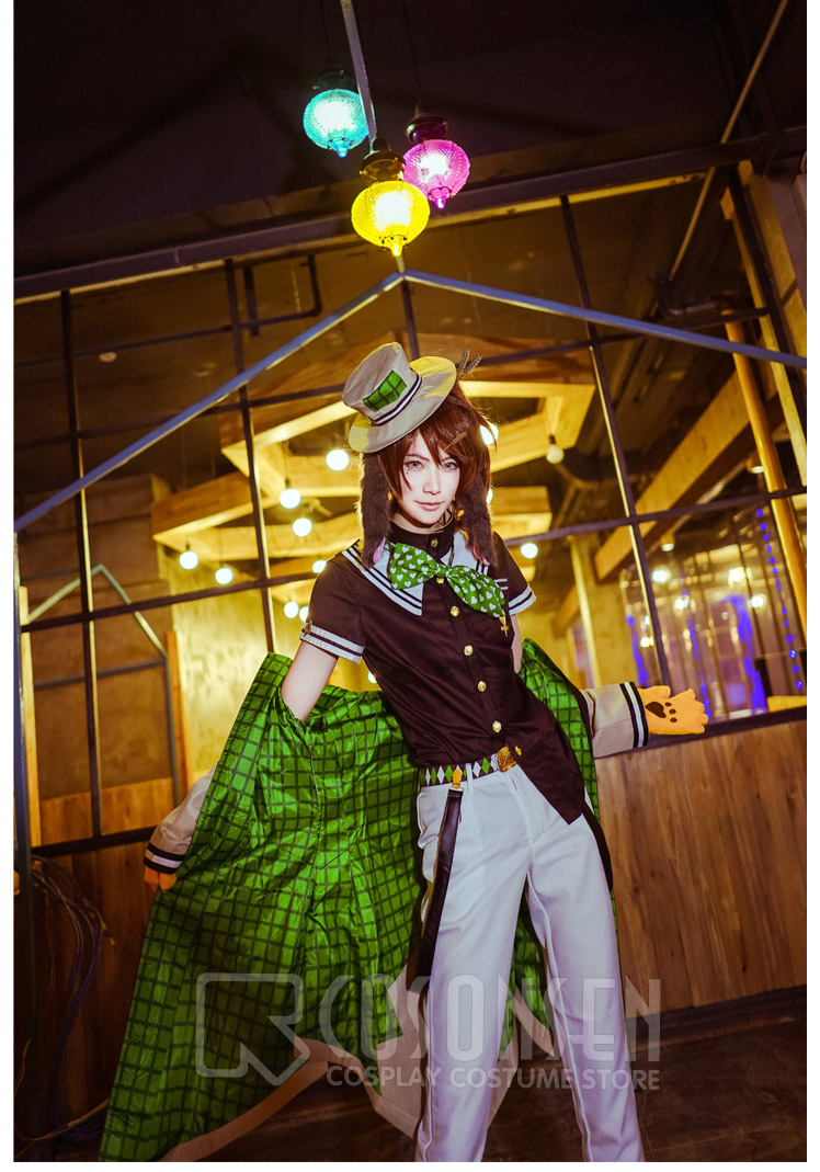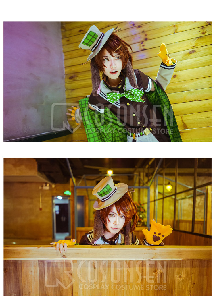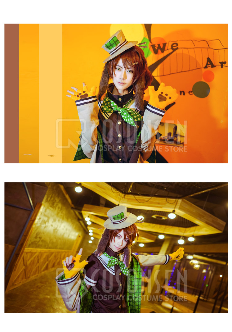 コート、Tシャツ、ズボン、飾り物(帽子、猫爪手袋、蝶ネクタイ、ベルトx3、ソックス、耳x2)