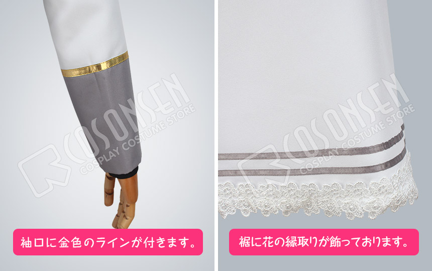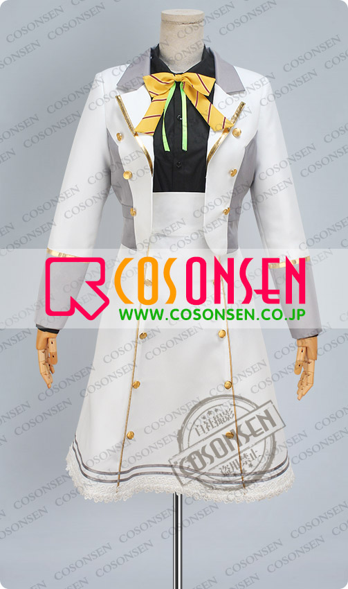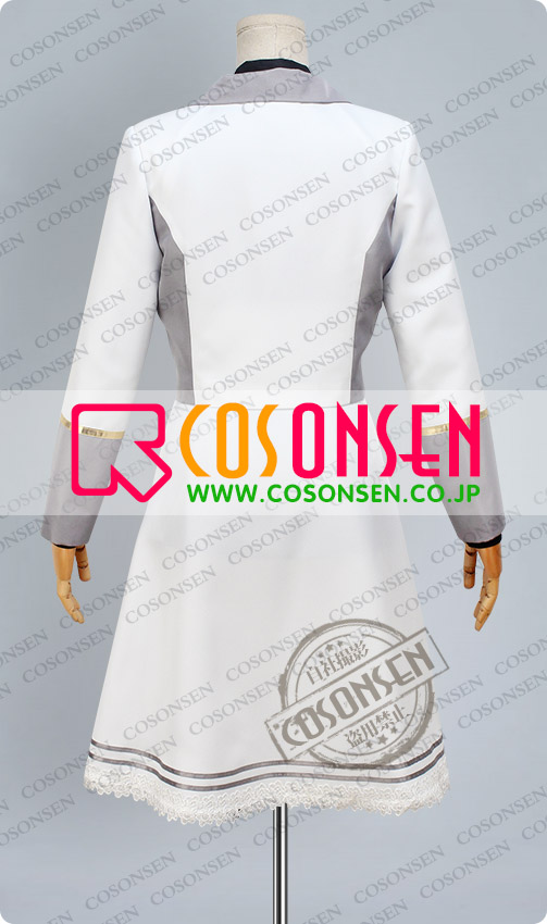白色と灰色を基調したポリ混紡にて製作します。襟と袖に金色のラインが付き、原作を完璧に再現しました。