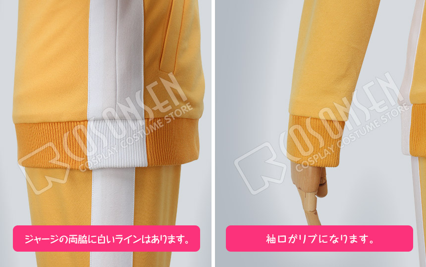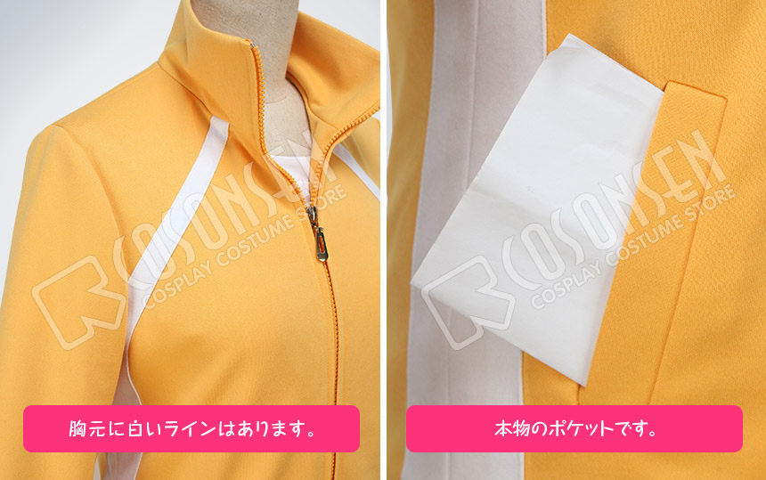 黄色を基調した綿とポリエステルにて製作します。立て襟のデザインが原作に忠実しています、袖口と裾はリブになって、細部までこだわっています。