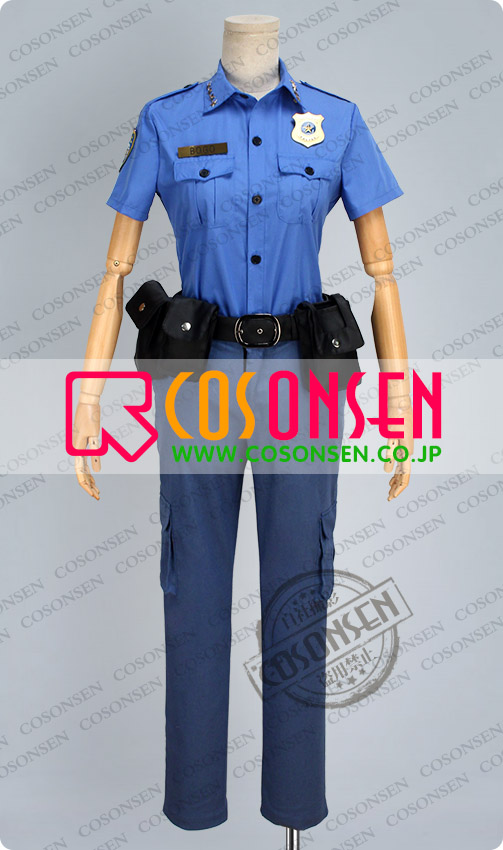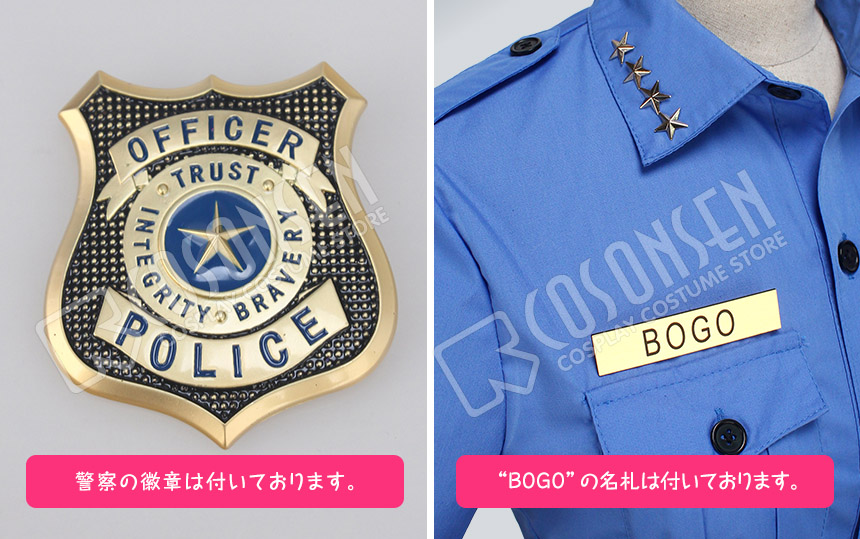 青を基調したシャツ生地にて製作します。胸元に本物のポケットはあり、還元度高い警察の徽章と名札も付き、かっこいいです。
