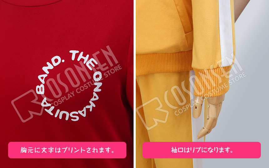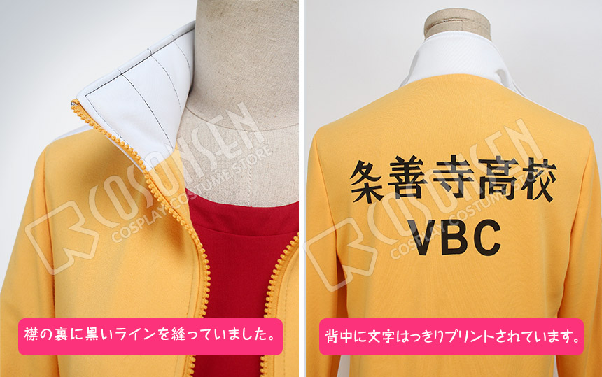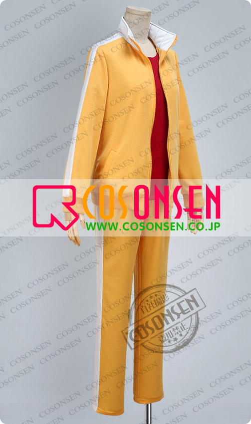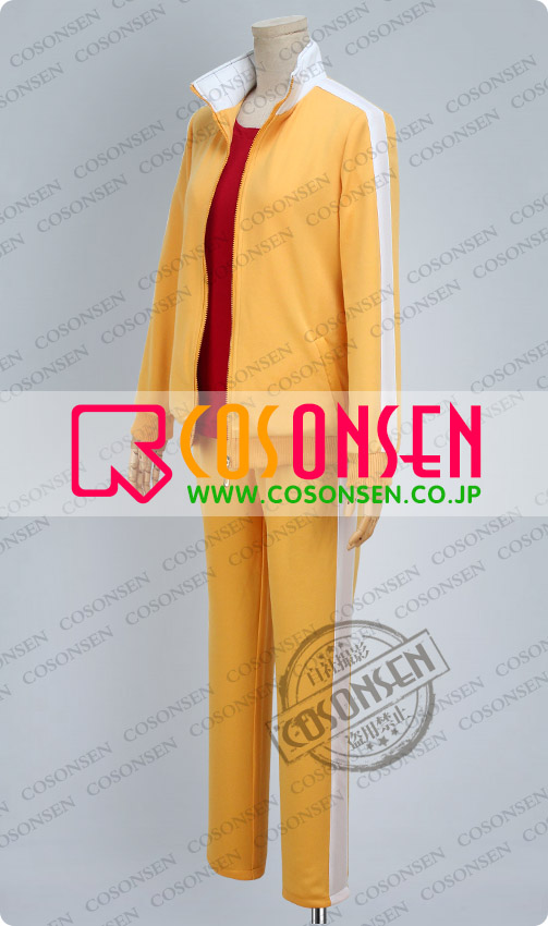 黄色を基調した綿とポリエステルにて製作します。立て襟のデザインが原作に忠実しています、袖口と裾はリブになって、細部までこだわっています。