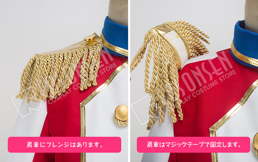 白と赤を基調したポリ混紡にて製作します。燕尾服のデザインで、音楽家イメージがあります。縁取りは合皮製になり、金色の肩章とボタンと合わせて、豪華に見えます。隠しファスナーで簡単に脱着できます。