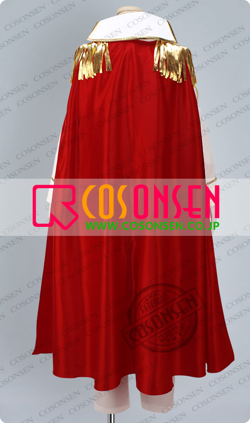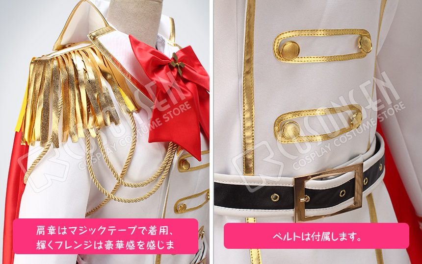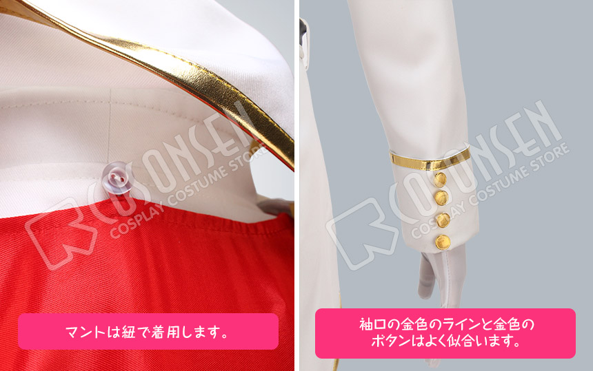 白を基調したポリ混紡生地にて製作します。金色のラインはたくさん飾っており、豪華感を感じます。立て襟もかっこいいです。燕尾服の形になります。