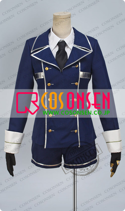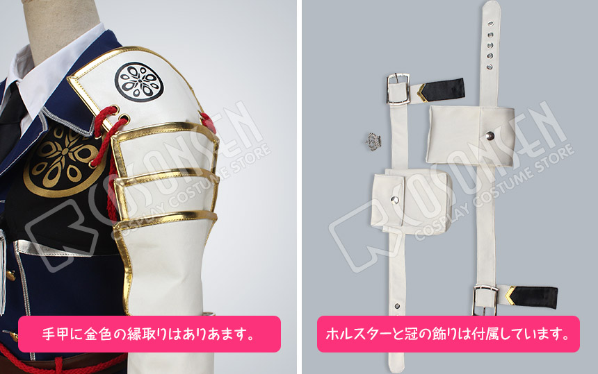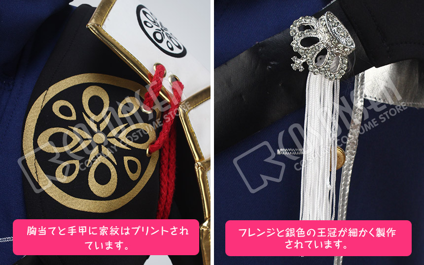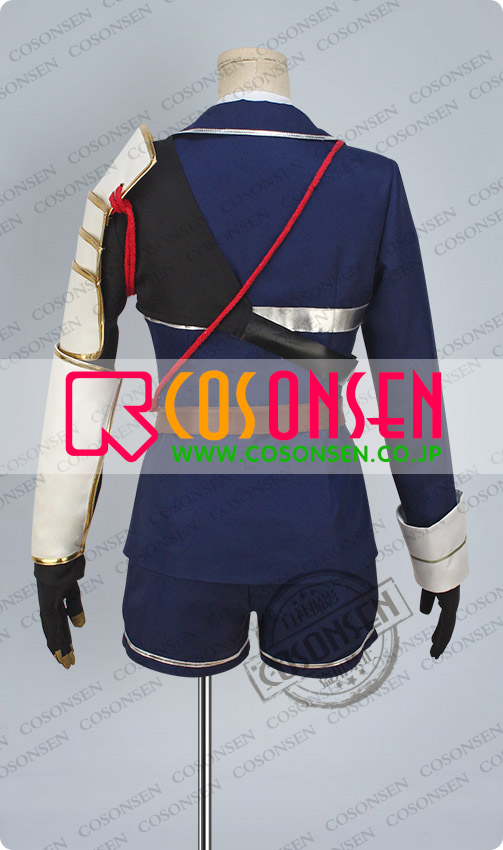 紺色を基調したポリ混紡生地にて製作します。正面に金色のポタンが二列飾っています。左手にアームカバー、手鎧と手袋が付きます。胸のベルトも見事に原作を再現しました。腰に飾り物も完璧に再現されています。