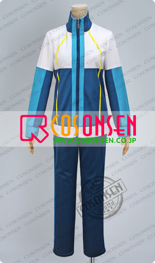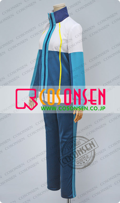 白、青と紺色を基調したにジャージ生地にて製作します。正面にファスナーが付きます。脱着が簡単にできます。両側に黄色のラインが飾って、原作に上手く再現しました。