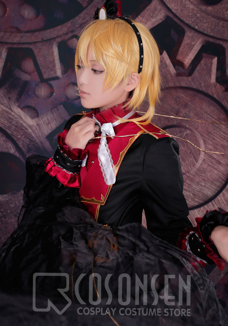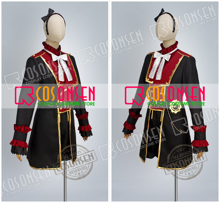 黒を基調したポリ混紡にて制作します。正面に縦の金色ラインは2つあり、裾にフリルも付きます。よく原作に忠実しています。