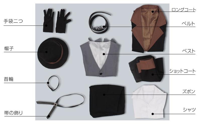 ロングコート、ショットコート、ベスト、シャツ、ズボン、飾り物(帽子、首輪、帯の飾り、ベルト、手袋二つ)