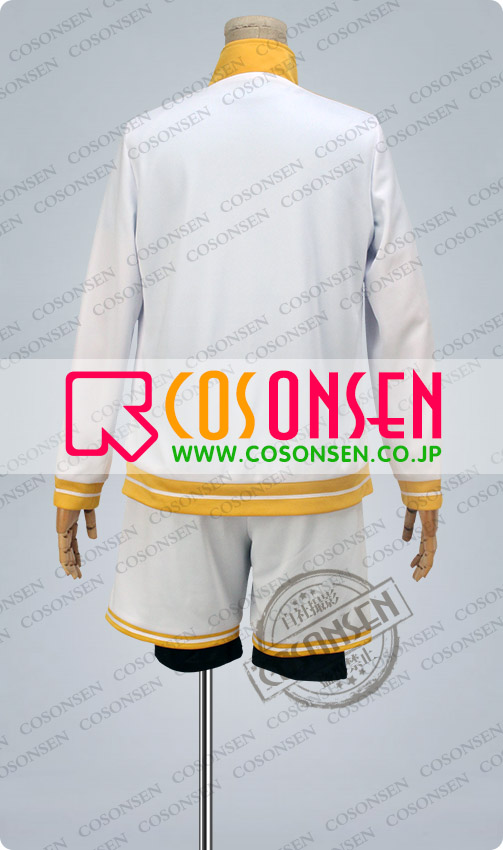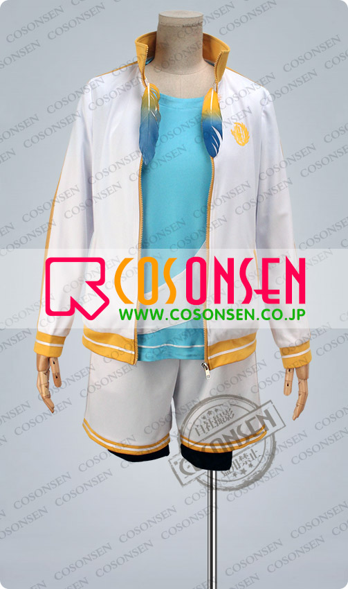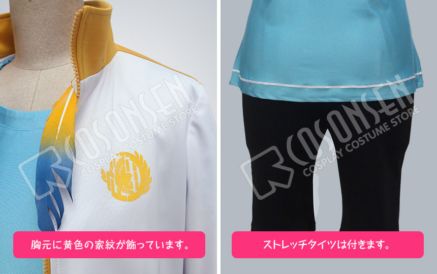 白を基調したジャージ生地にて製作します。立て襟のデザインです。襟に二本の羽飾りは飾っており、胸元に黄色の家紋が飾っています。ファスナーで簡単に脱着できます。