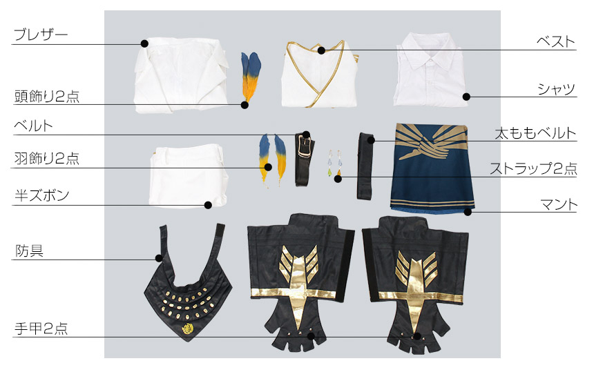 マント、ブレザー、ベスト、シャツ、半ズボン、飾り物(防具、羽飾り2点、頭飾り2点、紐、ストラップ2点、ベルト、手甲2点)